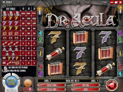 Deep in the depths of Castle Acula, the Doctor awaits. Assisted by his charming nurse and his bevy of bats, Dr. Acula has a sure cure for whatever is ailing his patients. Treatment starts with just one spin of this easy playing 3-reel with five pay lines. The icon set includes a squirty syringe, pulsating plasma bags and tinkling test tubes. Also included are lucky lightning sevens, the Doctor and Nurse Acula