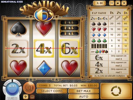 Play this retro-inspired classic slot and get ready to be transported to a different era: a winning era! Sensational Sixes is a tasteful game that features three different wild symbols as well as multipliers ranging from 2X and all they way up to 6X. If you manage to land all 3 multipliers you'll be collecting the huge jackpot prize! In other words, there are plenty of winning opportunities coming from all directions! Win when landing symbols such as the traditional BAR's, black spades, red hearts, blue diamonds, and also green clubs.